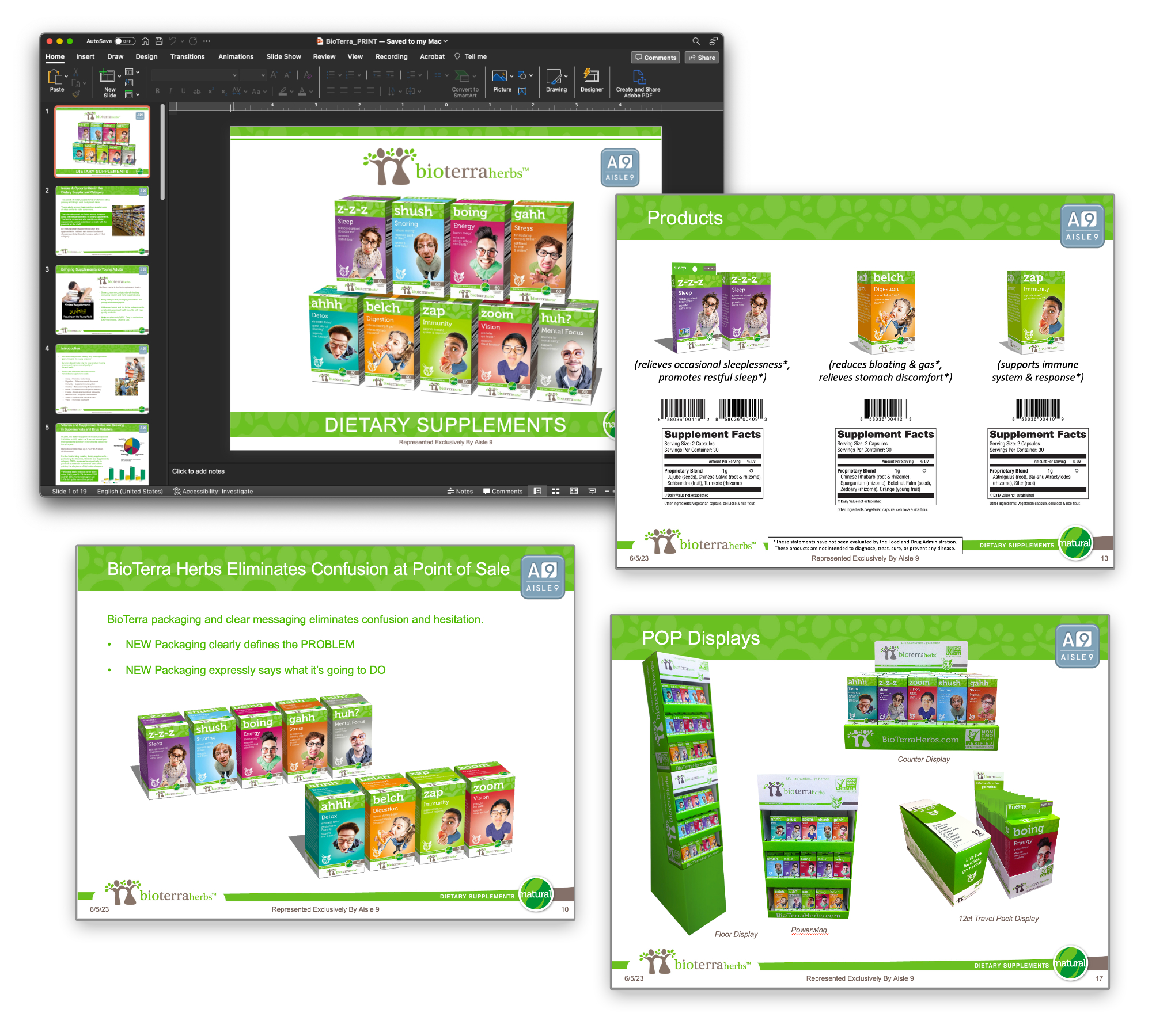 My Role: I did layout and production work on the supplements packaging, created 3D models for the packaging, POPs, and floor displays. Then I setup a PowerPoint presentation and other materials for the sales team.